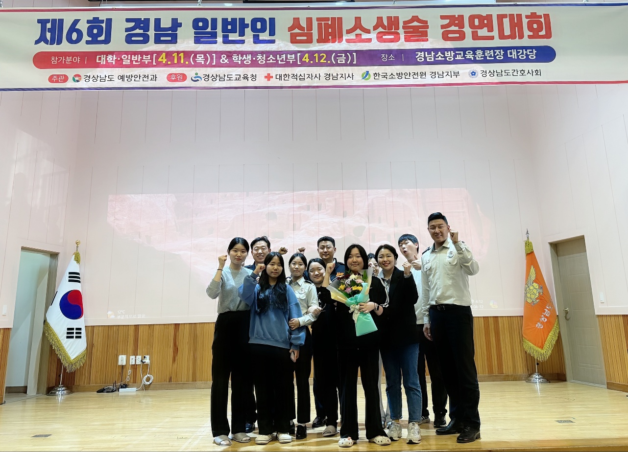 - 대회 일시 : 2024.04.12.(금) 10:00 ~ 15:30 - 대회 장소 : 경남소방교육훈련장 대강당(의령군) - 참가 학생 : 보건간호과 자율 동아리[골든타임] 학생 4인 위급한 상황에서 자신과 타인을 보호할 수 있는 필수적인 기술을 습득하고자 학생들과 열심히 준비하여심폐소생술 경연대회에 참가하였습니다. 이번 대회를 통해 학생들이 안전사고 예방에 관련된 기술 능력은 물론 협동심, 책임감, 리더십을 강화하는 데 큰 도움이 되었으며, 경연대회에는 첫 참가임에도 불구하고 쟁쟁한 19개 팀 중에서 자랑스럽게도 3등을 거머쥐는 쾌거를 이루었습니다.